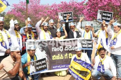 Photo Caption : Members of AAP stage a protest at Freedom Park against the VB-G RAM G Bill, introduced by the union government to replace the MGNREGA, in Bengaluru on Friday 19th December 2025