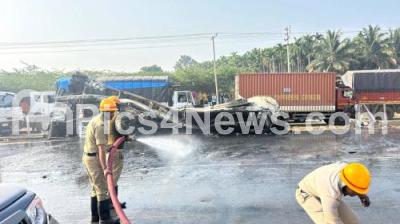 Photo Caption : Firemen douse off the charred and mangled remains of the private sleeper bus which was involved in an accident on NH 48, which has claimed 5 lives so far, in Chitradurga on Thursday 25th December 2025