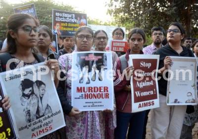 Photo Caption : Members of likeminded progressive organizations, Bangalore demand justice for the victim who was brutally murdered by her father for inter caste marriage at Hubballi during their protest at Freedom Park, in Bengaluru on Friday 26th December 2025