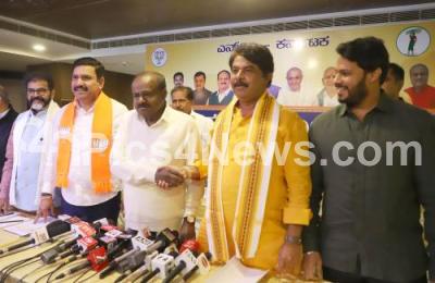 Photo Caption : Union Minister and JD(S) State President HD Kumarswamy with BJP State President BY Vijayendra, BJP and JD(S) leaders R Ashoka, Chalavadi Naraynswamy, Nikhil Kumarswamy and others during joint press conference at a private hotel, in Bengaluru on Saturday 10th January 2026