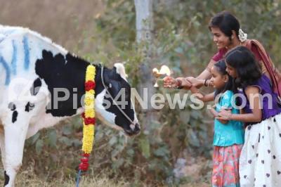 Photo Caption : Girls performing pooja to cow on the occasion of Sankranthi Festival, at Kengeri, in Bengaluru on Thursday 15th January 2026