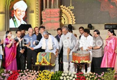 Chief Minister Siddharamaiah ,Council Chairman Basavaraj Horatti, Actor Shivaraj Kumar, Actress Jayamala, MLC Govinda Raju and other officials during the Bengaluru Habba 2026 Inauguration at Vidhana Soudha, in Bengaluru on Friday 16th January 2026