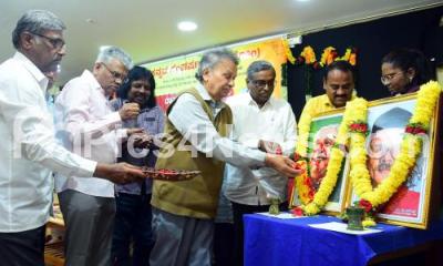 Photo Caption : Prof Baraguru Ramachandrappa with Ramanna H Kodihosanahalli, Dr Srinivasmusthy and others paying tribute to Rashtra Kavi Kuvempu and DR Bendre birth anniversary and award program at Kannada Sahitya Parishat, in Bengaluru on Sunday 18th January 2026