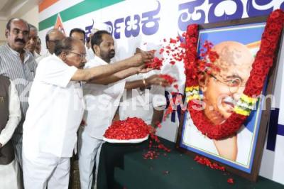 Photo Caption : Former Union Minister Veerappa Moily along with Congress leaders pays floral tribute to Mahatma Gandhi portrait during the Sarvodaya Day to observed on January 30th commemorates the assassination of Mahatma Gandhi, at KPCC office, in Bengaluru on Friday 30th January 2026