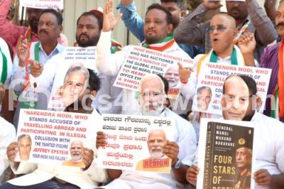 Members of Bengaluru City Youth Congress protest demanding probe into Prime Minister Narendra Modi involvement in the investigative files related to Jeffrey Epstein, in Bengaluru on Thursday 5th February 2026