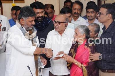 Photo Caption : DCM DK Shivakumar distributed the compensation cheque to the victims of the Bangalore Business Corridor (formerly PRR) road landslide at the BDA office, in the presence of BDA President NA Harris, BDA Commissioner Manivannan and others, in Bengaluru on Thursday 5th February 2026