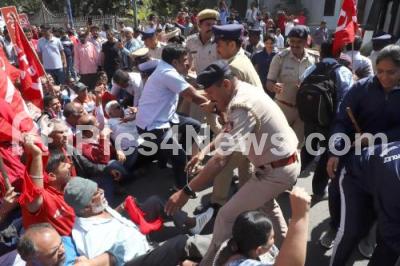 Members of Central Trade Unions and Farmers Associations detained by police personnel at Town Hall, during their protest against the policies of the Central government, in Bengaluru on Thursday 12th February 2026