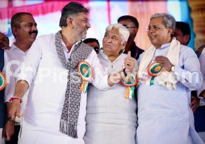 Photo Caption : Chief Minister of Karnataka Siddaramaiah with DK Shivakumar, Home Minister Dr. G Parameshwara, Ministers Krishna Byre Gowda, Shivananda Patil, HK Patil, Satish Jarakiholi, KH Muniyppa and others during the Congress Sadhana Samavesha Convention, on the Completion of 1000 days of Congress Government, in Haveri on Saturday 14th February 2026