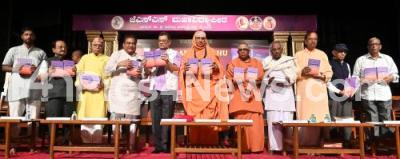 Sri Shivaratri Desikendra Mahaswamiji and Justice Deekshit Krishna Prasad releasing a book titled "Vachanas of Allamma Prabhu" during the program at JSS, also seen are Minister MB Patil, Go Ru Channabasappa, Basavalinga Swamy and others , in Bengaluru on Saturday 28th March 2026