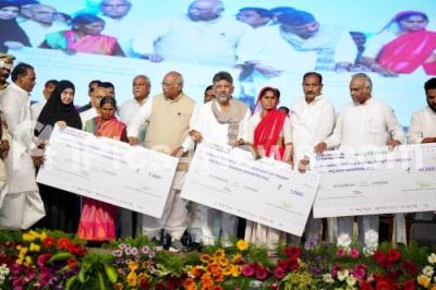 Photo Caption : DCM DK Shivakumar with AICC President Mallikarjun Kharge, Ministers Sharan Prakash Patil, Priyank Kharge, Sharanabasappa Darshanapura, Ambigara Chowdary Development Corporation Chairman Baburao Chinchansur, MLAs Channareddy, M. Y. Patil, Allammaprabhu Patil, Legislative Council members Chandrashekar Patil, Jagadeva Guttedar, Thippanappa Kamakanur and others during the foundation stone laying ceremony of various development works in Kalaburgi on Sunday 8th March 2026