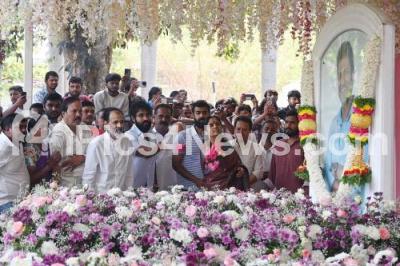 Photo Caption : Ragavendra Rajkumar and his family members offering floral tribute to Puneeth Rajkumar during his birth anniversary at Kanteerava Studio, in Bengaluru on Tuesday 17th March 2026