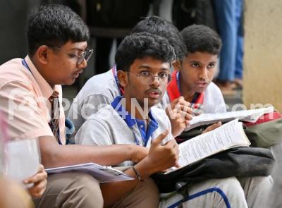 Students make last minute preparations before entering the exam hall to write SSLC exams at a school, SSLC exams start today in Karnataka State, in Bengaluru on Wednesday 18th March 2026