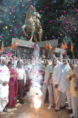 Photo Caption : BJP Party workers celebrating the victory of BJP in Himachal Pradesh elections in front of Basaveshwara circle, in Bangalore on Friday 28th Dec 2007.