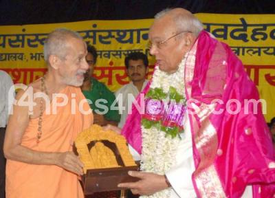 Photo Caption : Governor Rameshwar Thakur being felicitated by Vishweshwara Theertha Swamiji of Pejawar Mutt during the Valedictory function of All India Sanskrit Elocution Contest at Poorna Pragna Mandir, Katriguppa organised by Rashtriya Sanskrit Sansthan, in Bangalore on Friday 28th Dec 2007.
