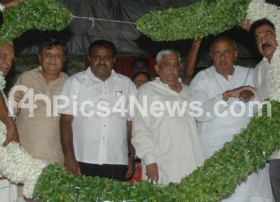 Photo Caption : Siddanna Gowda,Ex Minister and Basavaraja Patil Anvari being felicitated by party workers during the JDS Party Conference at Palace Grounds, in Bangalore on Monday 31st Aug 2009