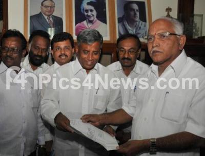Photo Caption : V Somanna, Minister for Housing and Muzarai Department submitting his resignation to CM BS Yediyurappa at CM chamber in Vidhana Saudha,also seen his supporters, in Bangalore on Monday 31st Aug 2009