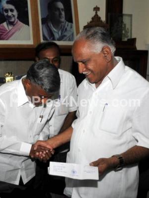 V Somanna, Minister for Housing and Muzarai Department submitting his resignation to CM BS Yediyurappa at CM chamber in Vidhana Saudha,also seen his supporters, in Bangalore on Monday 31st Aug 2009