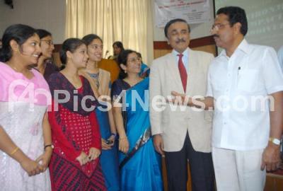 Small Savings and Lotteries Minister Krishna Palemar and Bangalore University Vice Chancellor Dr N Prabhudev interacting with students during the one day seminar on Environmental Impact on Biodiversity organised by Department of Zoology at Jnana Jyothi Auditorium, in Bangalore on Friday 26th February 2010
