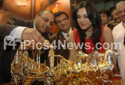 Photo Caption : Actress Ramya with C Vinod Hayagriv, Chairman, GJF and Sumesh Wadhera, Managing Director, The Art of Jewellery looking at the gold plated “Ratha†made of Silver during the inauguration of 4th South India Jewellery Show - SIJS 2010 at Kanteerava Indoor Stadium, in Bangalore on Saturday 20th March 2010