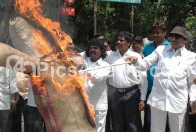 Event Description : Vatal Nagaraj, President Kannada Chaluvali Vatal Paksha with his supporters protesting Tamil Nadu Government for implementing Hogenakkal Drinking Water Project, protest held at MG Statue, in Bangalore on Saturday 20th March 2010