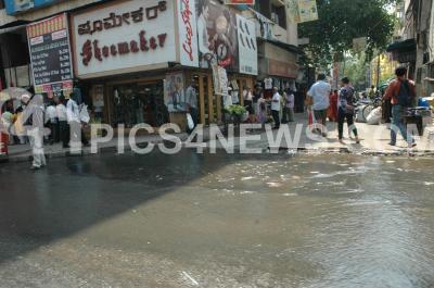 Photo Caption : Overflowing drain water making it difficult for people to pass through the Brigade Road, in Bangalore on Sunday 11th April 2010