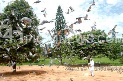 A person feeding pigeons in front of High Court, in Bangalore on Saturday 19th June 2010