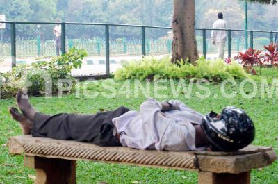A man taking nap under the tree by wearing helmet at Cubbon Park, in Bangalore on Monday 11th Feb 2008.