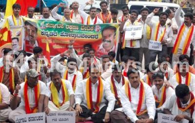 Photo Caption : Members of Karnataka Rakshana Vedike staging a dharna in front of KPCC office protesting regarding Belgaum issue, in Bangalore on Thursday 15th July 2010