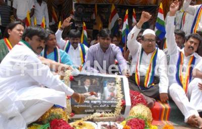 Photo Caption : Members of Akhila Bharatha Dalitha Kriya Samithi protesting against opposition leaders and legislatures for eating non veg during dharana during Assembly Session at Vidhana Soudha, protest held at MG Statue MG Road, in Bangalore on Thursday 15th July 2010