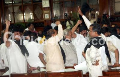 Photo Caption : Opposition Leader Siddaramaiah with other MLAs seen staging a protest during Assembly Session at Vidhana Soudha also seen Speaker KG Bopaiah, in Bangalore on Thursday 15th July 2010