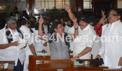 Photo Caption : Opposition MLAs seen protesting during Assembly Session at Vidhana Soudha, in Bangalore on Thursday 15th July 2010