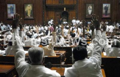 Photo Caption : BJP MLAs raising hands during passing of the bill at Assembly Session as Opposition MLAs protest continues at Vidhana Soudha, in Bangalore on Thursday 15th July 2010