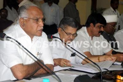 Photo Caption : CM BS Yediyurappa addressing during a meeting with Divisional Commissioners, Chief Secretaries and ZP Presidents for the Ashraya Houses for the Flood Effected Villages at Vidhana Soudha also seen Home Minister VS Acharya, Ministers Karunakara Reddy Katta Subramanya Naidu and others, in Bangalore on Thursday 15th July 2010