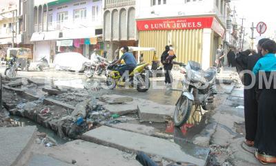 Overflowing drain water making it difficult for people to pass through the Jain Temple Road, Shivajinagar, in Bangalore on Wednesday 12th Feb 2008.