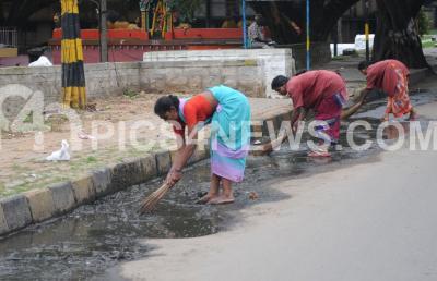 Photo Caption : Workers cleaning over flown drainage water from the road at Siddapura near Lalbagh, in Bangalore on Saturday 28th Aug 2010