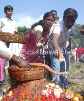 Photo Caption : Devotees offering milk to the snake at an anthill near Subramanyeshwara Swamy Temple on the occasion of Subramanya Shashti at Siddalingapura on Mysore Bangalore Highway, in Mysore on Saturday 11th Dec 2010