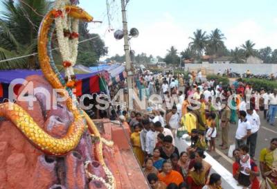 Photo Caption : Devotees gathered at Subramanyeshwara Swamy Temple to perform pooja on the occasion of Subramanya Shashti at Siddalingapura on Mysore Bangalore Highway, in Mysore on Saturday 11th Dec 2010