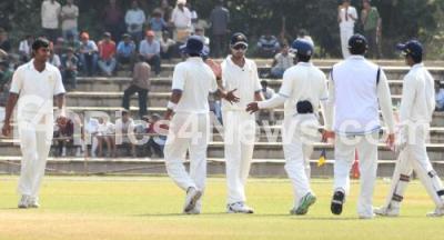 Photo Caption : Karnataka Players celebrate the wicket of Baroda batsman during Ranji Trophy Cricket match between Karnataka and Baroda at Gangotri Glades in Manasagango, in Mysore on Saturday 11th Dec 2010
