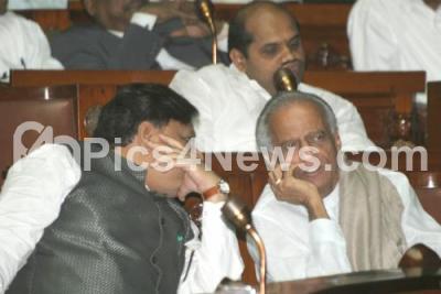 Photo Caption : Former Karnataka Deputy Chief Minister MP Prakash who died at a private hospital in Bangalore today after a prolonged battle with cancer, seen in a file photo with then JDS President Meerajudin Patel during Assembly Session of 19th Nov 2007 at Vidhana Soudha, in Bangalore on Wednesday 9th Feb 2011