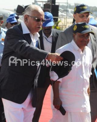 Photo Caption : CM BS Yediyurappa and Union Defence Minister AK Anthony seen during the inauguration of Aero India 2011, Asia’s premier air show at Yelahanka Airforce Station, in Bangalore on Wednesday 9th Feb 2011