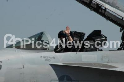 Photo Caption : Pilot of Boeing Super Hornet FA 18 waves to the crowd as he gets ready to take off to display aircrafts aerobatic skills during Aero India Show 2011 at Yelahanka Air force Station, in Bangalore on Wednesday 9th Feb 2011
