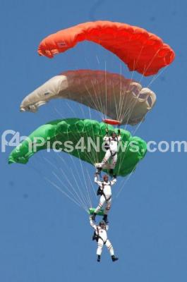 Photo Caption : Members of Akash Ganga team of the Indian Army displaying their skills of para jumping during Aero India Show 2011 at Yelahanka Air force Station, in Bangalore on Wednesday 9th Feb 2011