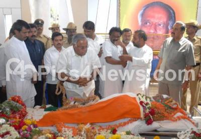 Photo Caption : JDS Leader PGR Sindhiya paying his last respects to Former Deputy CM MP Prakash who passed away today in Bangalore, body was kept for public viewing at Freedom Park, in Bangalore on Wednesday 9th Feb 2011