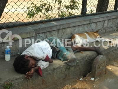 A person seen taking a nice nap along with his dogs on a footpath under a tree to beat the hot summer at Vasanthnagar, in Bangalore on Monday 28th March 2011