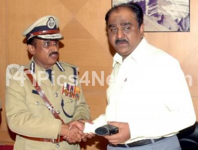 Photo Caption : Outgoing Bangalore City Police Commissioner Shankar Bidari presenting the baton to the newly appointed Bangalore City Police Commissioner Jyotiprakash Mirji at a ceremony at the Police Commissioner Office, in Bangalore on Monday 2nd May 2011