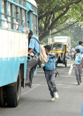 School boys try to board running bus during the peak hours of the day at Vittal Mallya Road, in Bangalore on Wednesday 19th March 2008.