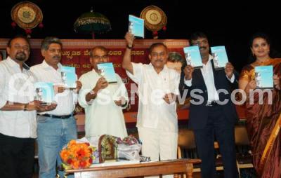 Photo Caption : SG Siddaramaiah, Former President of Pustaka Pradhikara with Music Director Hamsalekha, Poet KY Narayanswamy and others seen releasing an Anthology “Kuntimansu†of NJ Ravishekar during a cultural festival, music CD and anthology release programme at Ravindra Kalakshetra organised by Swara Samskruthika Vedike, Sirivara Prakashana and Geetha Academy of Performing Arts, in Bangalore on Friday 24th June 2011