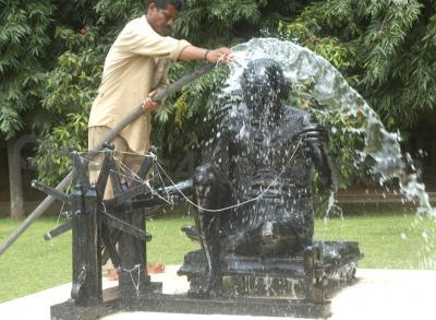 Photo Caption : Workers cleaning Mahatma Gandhi Statue for tomorrow’s Gandhi Jayanthi at MG Road