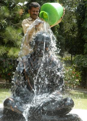 Photo Caption : Workers cleaning Mahatma Gandhi Statue for tomorrow’s Gandhi Jayanthi at MG Road