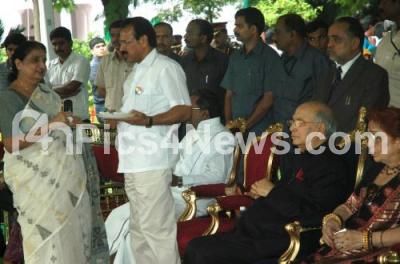 Photo Caption : Governor HR Bhardwaj with Chief Minister DV Sadananda Gowda, Opposition Leader Siddaramaiah, Former Governor VS Ramadevi and Prafulatha Bhardwaj seen at a tea party hosted by the Governor at Raj Bhavan on the occasion of 65 Independence Day celebration, in Bangalore on Monday 15th August 2011